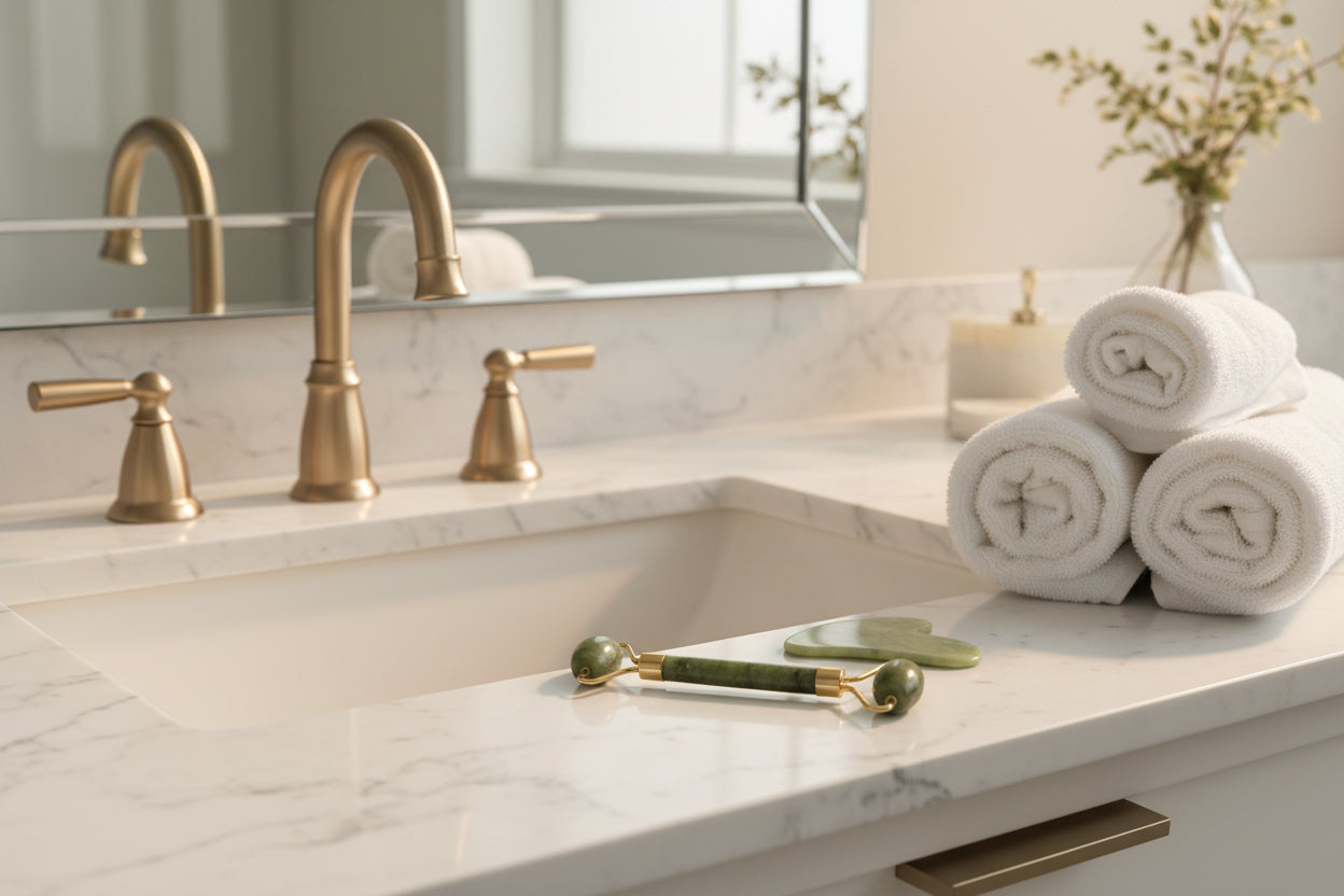 Jade roller = gentle depuffing (great around eyes). Gua Sha = deeper massage to sculpt, lift, and relieve jaw/neck tension.